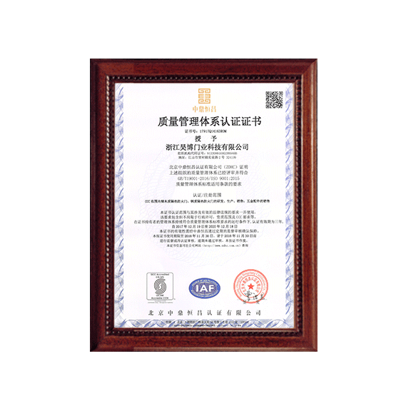 公司一直以來嚴格執(zhí)行ISO9001質(zhì)量體系和ISO14001環(huán)境管理體系標準,建立了完備的科研、開發(fā)、生產(chǎn)、銷售服務(wù)體系。公司是浙江省門業(yè)協(xié)會會員單位,江山門業(yè)協(xié)會理事單位,中國木材與木制品流通協(xié)會會員單位,江山市消防協(xié)會副會長單位。